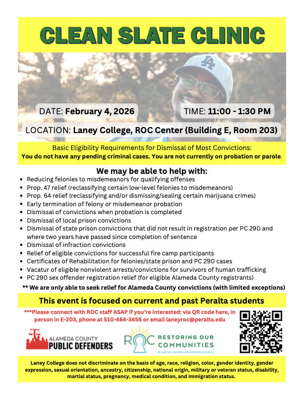 Laney College is hosting a Clean Slate Clinic to help eligible current and former Peralta students explore options for clearing or reducing past convictions. Services may include record dismissal, Prop 47/64 relief, probation termination, certificates of rehabilitation, and other qualifying support.