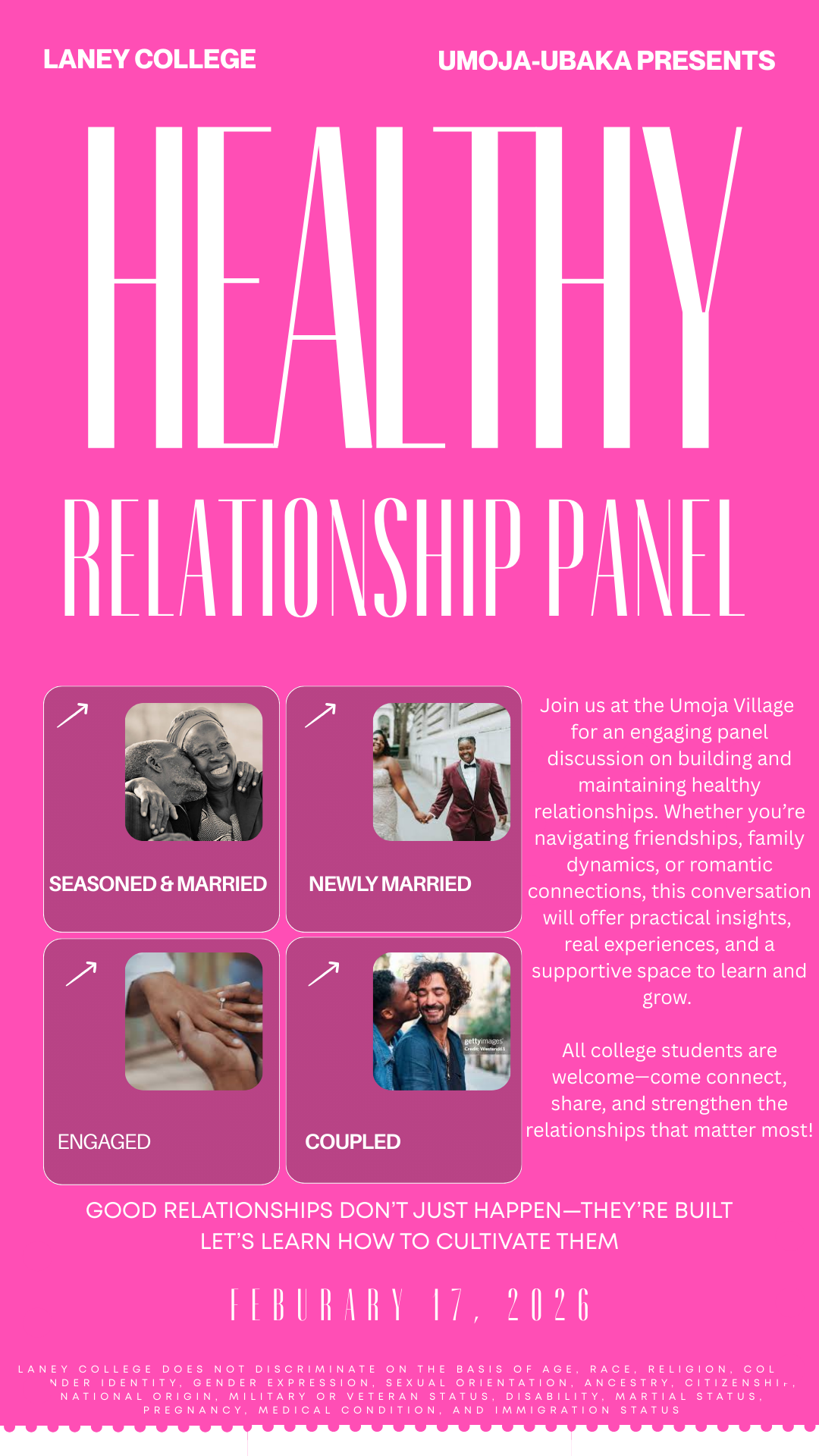 Join Umoja-Ubaka for an engaging panel discussion on building and maintaining healthy relationships. Panelists representing different stages of partnership—seasoned & married, newly married, engaged, and coupled—will share real-world experiences and practical strategies.