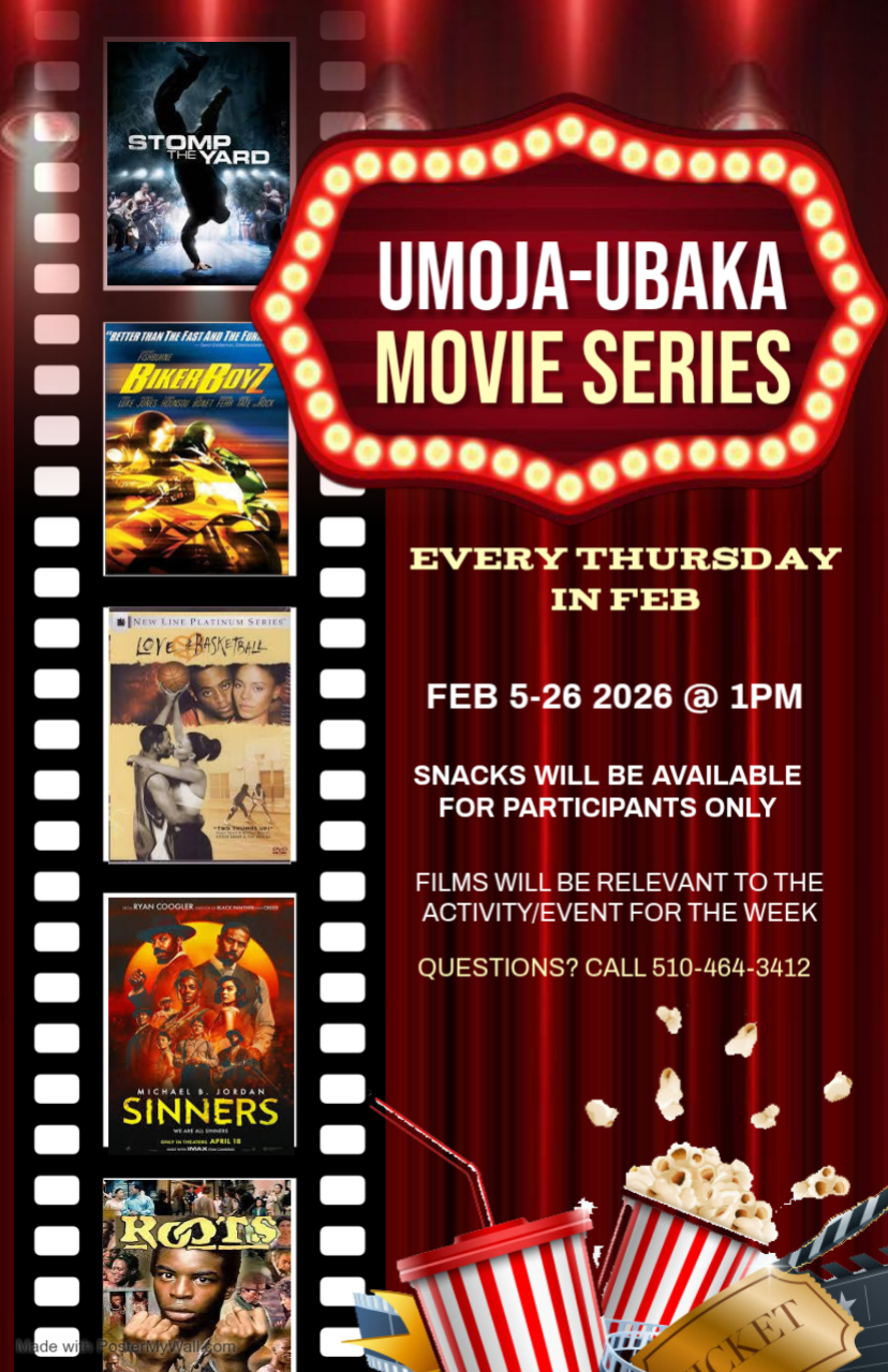Join Umoja-Ubaka every Thursday in February for a weekly film screening tied to that week’s activity or theme. Enjoy thought-provoking movies and snacks while connecting with community.
