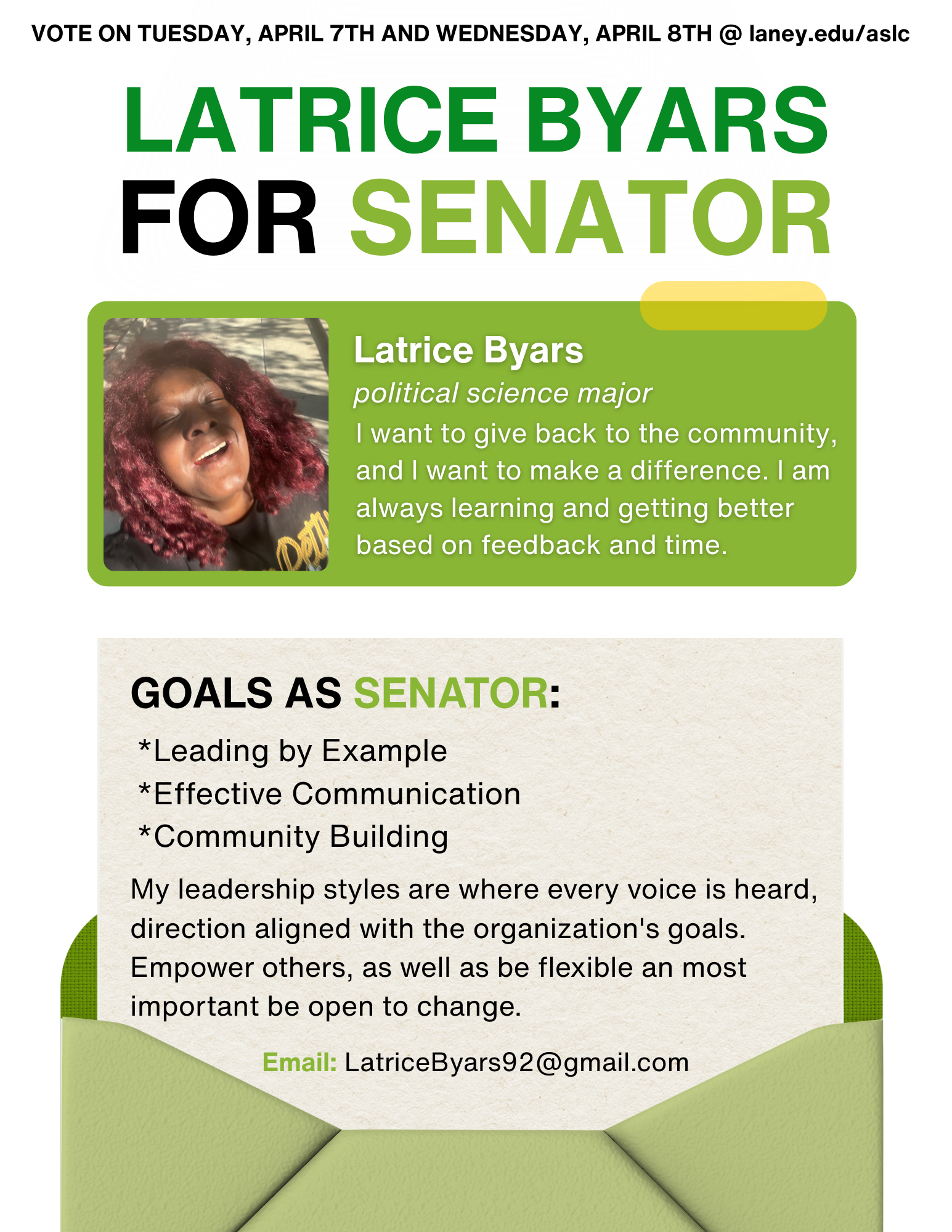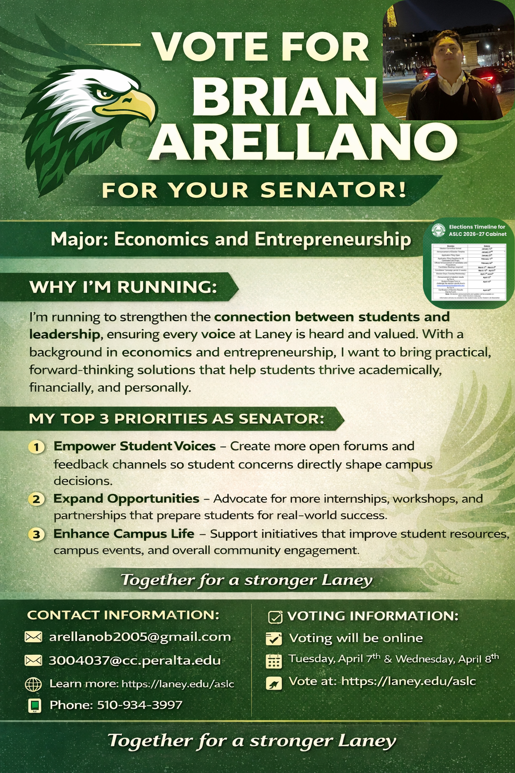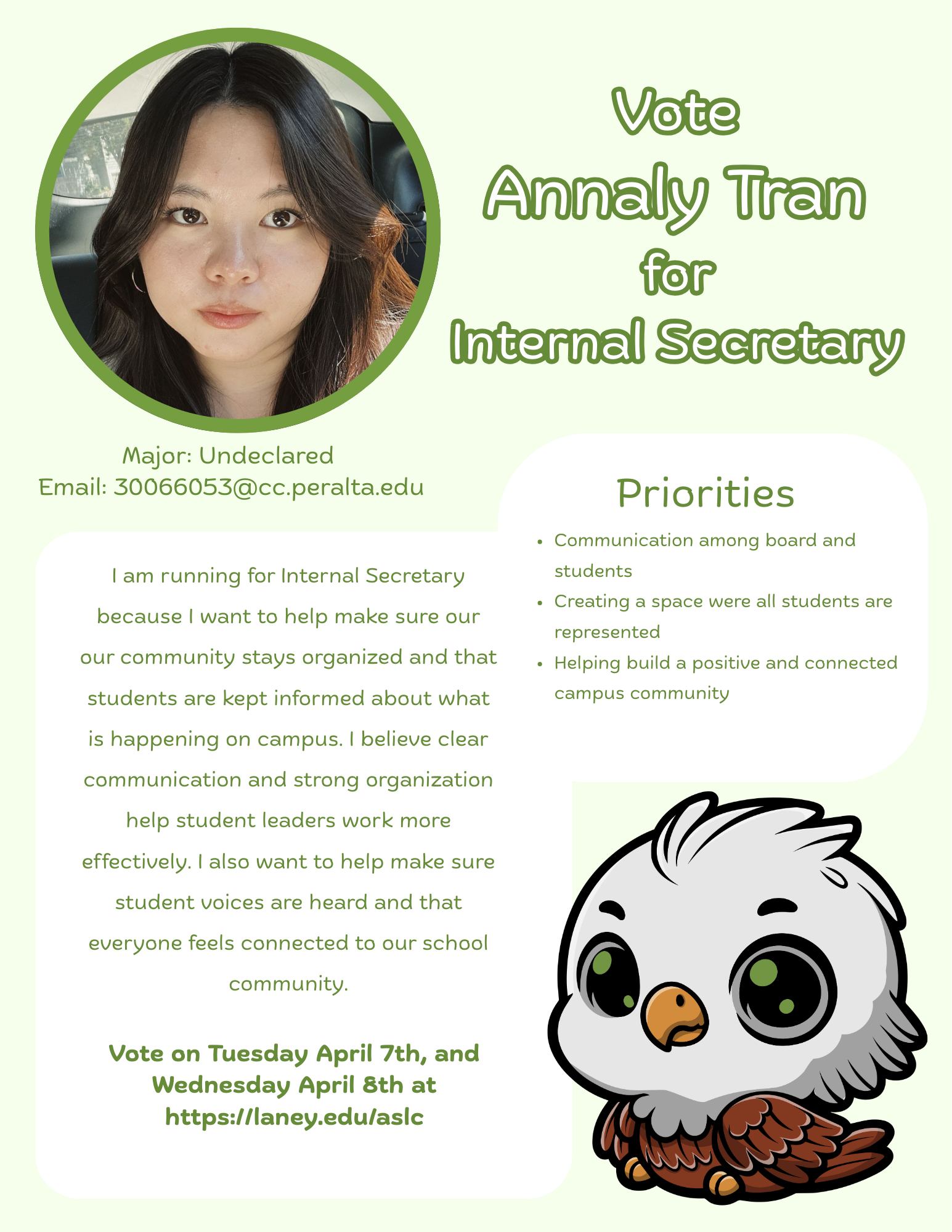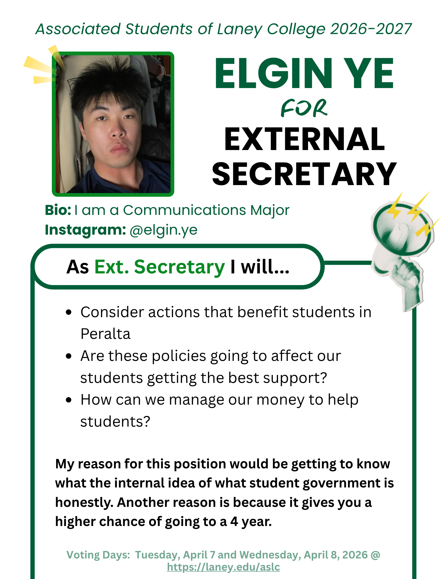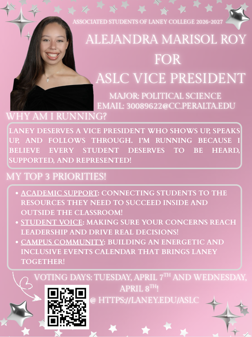 The Associated Students of Laney College (ASLC) elections are here! Campaigning runs from March 10 - April 6, 2026, giving students the opportunity to learn more about each candidate.