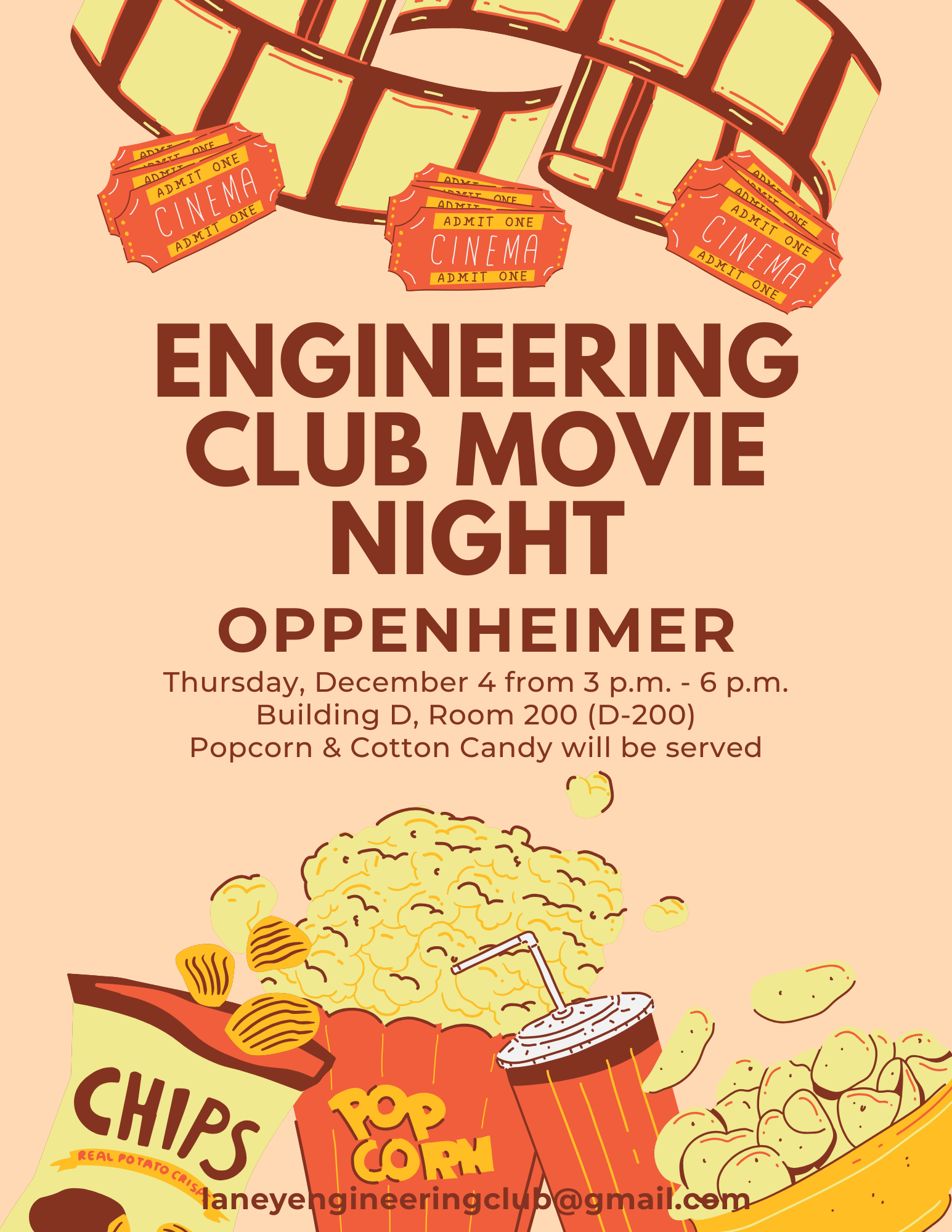 Join the Laney College Engineering Club for a fun and relaxing movie night featuring Oppenheimer! Take a break from studying, connect with fellow students, and enjoy popcorn and cotton candy while we watch this acclaimed film.