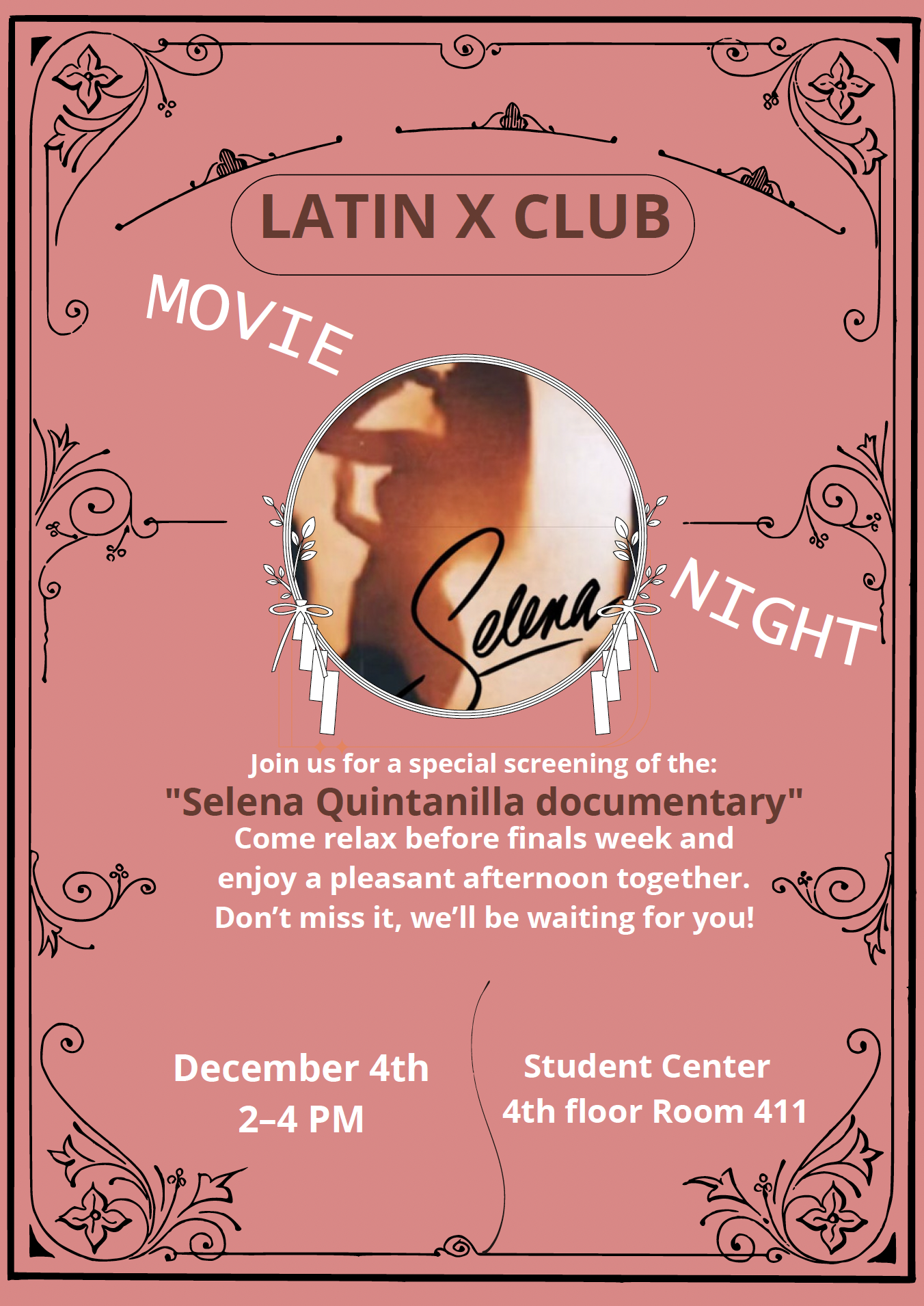 Join the Latinx Student Club for a relaxing afternoon screening of a Selena Quintanilla documentary—the perfect way to de-stress before finals week. All students are welcome!